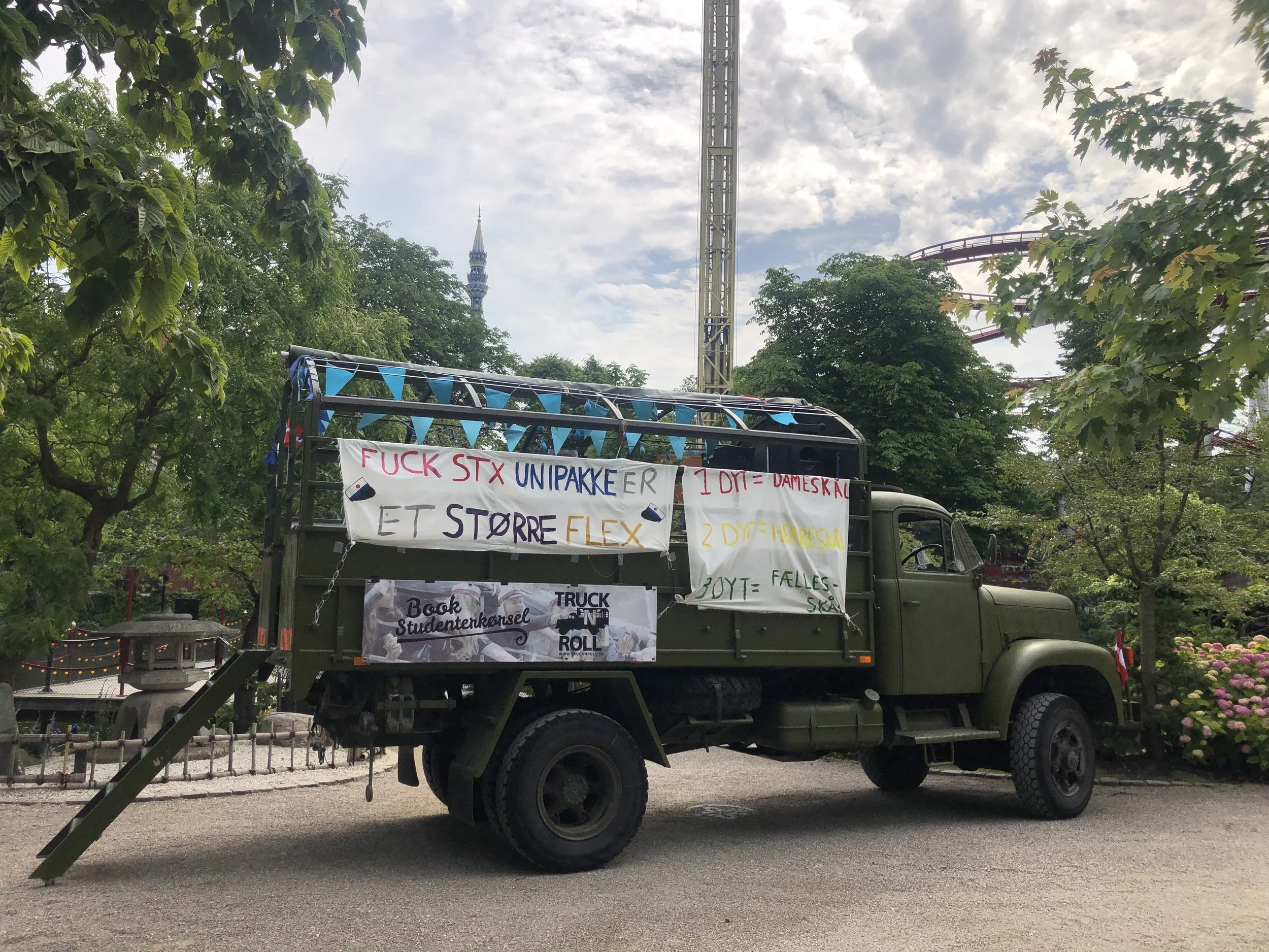 At vælge den rette bil og chauffør, til at køre dig og dine medstuderende, når I skal fejre jeres eksamen og afslutningen på jeres studiestrabadser, kan være svært. Der er mange om buddet. Men hos TRUCK `N´ ROLL vil vi give din en helt igennem hyggelig, sikker og eventyrlig rullede fest, i vores specialindrettede gamle militære lastbiler. Du betaler for ti timers kørsel inkl. en times pyntning. Bilerne er veteranlastbiler, hvilket betyder at de, selvom de er dieselbiler uden partikelfilter, godt må køre indenfor miljøzonerne i de større byer. Vi er er erfarne chauffører med vægt på sikkerhed og alle regler for eksamenskørsel overholdes til punkt og prikke. Vi er personforsikrede og bilerne synes årlig med fokus på persontransport.